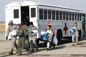 6일 오후 평택시 주한미공군 오산기지에서 열린 ‘항공의무후송훈련’에서 부상병들이 C-130 수송기로 이동하고 있다. /연합뉴스
