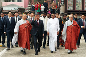 문재인 대통령이 28일 오후 조계사에서 국빈방한한 시리세나 스리랑카 대통령을 만나 함께 경내를 걷고 있다. /연합뉴스