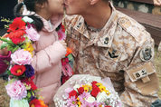 지난 10일 오후 광주시 오포읍 특수전학교에서 열린 아랍에미리트(UAE) 군사훈련협력단 ‘아크부대’ 13진 환송식에서 김태신 소령이 자녀들과 인사를 하고 있다. /연합뉴스