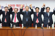 자유한국당 홍준표 대표가 9일 오전 서울 여의도 당사에서 열린 재입당 국회의원 간담회에서 바른정당을 탈당한 김무성, 강길부,김영우, 김용태, 이종구, 황영철, 정양석, 홍철호 의원과 손을 잡고 기념촬영을 하고 있다./연합뉴스