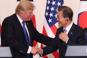 문재인 대통령과 도널드 트럼프 미국 대통령이 7일 오후 청와대에서 한미 공동 언론행사에서 악수하고 있다. /연합뉴스