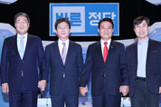 6일 오후 서울 여의도 KBS에서 열린 당대표 및 최고위원 선출을 위한 방송3사 초청 후보자 토론회에 참석한 정문헌(왼쪽부터)·유승민·박유근·하태경 후보가 토론회 시작전 포즈를 취하고 있다./연합뉴스