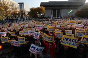 5일 오후 서울 광화문 세종로공원에서 열린 ‘트럼프 방한 즈음 시민평화행동 Peace Sunday’의 집회에서 참가자들이 전쟁반대와 평화협상을 촉구하고 있다./연합뉴스