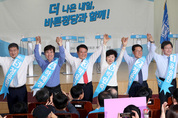 바른정당 유승민(오른쪽부터)·정운천·박인숙·박유근·하태경·정문헌 당대표 후보가 5일 국회 의원회관에서 열린 당대표 후보 경선토론회에서 손을 들어 지지자들에게 답례하고 있다./연합뉴스