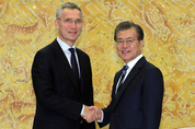 문재인 대통령이 2일 오후 청와대에서 옌스 스톨텐베르그 북대서양조약기구(NATO, 나토) 사무총장을 만나 얘기를 나누고 있다./연합뉴스