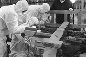 18일 오후 파주시 문화재청 전통건축부재보존센터에서 문화재청 관계자들이 숭례문 화재 수습 부재(部材) 가운데 공포결구체의 먼지를 털어내고 있다. /연합뉴스