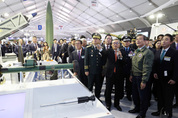 문재인 대통령이 17일 오전 성남 서울공항에서 열린 ‘서울 ADEX 2017’ 국제 항공우주 및 방위산업 전시회 개막식에서 참석자들과 전시물을 관람하고 있다./연합뉴스