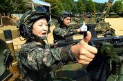 더불어민주당 추미애 대표가 26일 오전 9사단 전차대대를 방문, 전차에 탑승해 엄지를 치켜들고 있다./연합뉴스