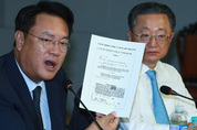 자유한국당 정진석 의원이 27일 오전 국회 의원회관에서 열린 ‘열린토론, 미래’ 정례 토론회에 참석해 노무현 정부 당시 국정홍보처가 국정원 및 각 부처에 보낸 ‘국정브리핑 언론보도종합 부처의견 관련 협조 요청’ 공문을 들어보이고 있다./연합뉴스