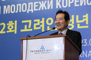 정세균 국회의장이 23일(현지시간) 우즈베키스탄 수도 타슈켄트 인터내셔널 호텔에서 열린 제2회 고려인 청년 창업 아이디어 공모전에 참석, 축사를 하고 있다./연합뉴스