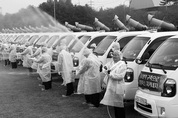 19일 오후 안성시 공도읍 농협미래농업지원센터에서 열린 ‘범농협 상시방역 선포식’에서 김병원 농협중앙회장을 비롯한 참석자들이 방역 시연을 하고 있다. /연합뉴스