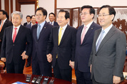 정세균 국회의장과 여야 4당 원내대표들이 19일 오후 국회의장실에서 진통을 겪고 있는 김명수 대법원장 임명동의안 처리 방안을 논의하기 위해 회동하고 있다. 왼쪽부터 국민의당 김동철, 더불어민주당 우원식, 정세균 국회의장, 자유한국당 정우택, 바른정당 주호영 원내대표./연합뉴스