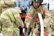11일 오전 인천시 남구 문학경기장 보조경기장에서 열린 ‘인천광역시 의용소방대 기술경연대회’에서 의용소방대원들이 ‘속도방수’ 경연을 펼치고 있다. /연합뉴스