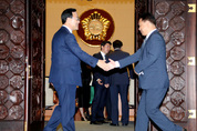 바른정당 주호영 원내대표(왼쪽)와 국민의당 이용주 의원이 11일 오후 국회 본회의에 참석하기 전 본회의장 앞에서 인사하고 있다. /연합뉴스