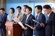 비판 MBC출신 더불어민주당의 김성수·노웅래·박광온·박영선·신경민, 국민의당 정동영·최명길 의원이 6일 오전 서울 여의도 국회 정론관에서 자유한국당 비판 기자회견을 하고 있다./연합뉴스