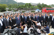김장겸 MBC 사장 체포 영장 발부에 반발해 정기국회 보이콧을 선언한 자유한국당 정우택 원내대표 등 의원들이 5일 오후 청와대 앞 분수대 광장에서 기자회견을 열고 청와대 항의 방문 결과를 설명하고 있다./연합뉴스