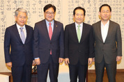 정세균 국회의장과 여야 3당 원내대표가 4일 오전 국회의장 접견실에서 열린 교섭단체 원내대표 회동에서 취재진을 향해 기념촬영을 하고 있다. 자유한국당 정우택 원내대표는 MBC사장 체포영장 발부 등에 항의해 불참했다./연합뉴스