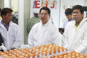 김영록 농림축산식품부 장관이 28일 오후 평택시의 한 산란계 농장을 방문해 계란집하장을 둘러보며 농장 관계자와 이야기를 나누고 있다. /연합뉴스