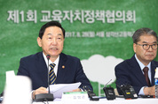 김상곤 사회부총리 겸 교육부 장관(왼쪽)이 28일 오후 서울 강북구 삼각산고등학교에서 열린 제1회 교육자치정책협의회에서 모두발언을 하고 있다. 오른쪽은 이재정 경기도교육감./연합뉴스