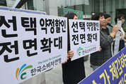 녹색소비자연대, 소비자공익네트워크, 소비자시민모임, 참여연대, 한국소비자연맹 등 통신 소비자·시민단체 회원들이 21일 오후 서울 중구 SK텔레콤 사옥 앞에서 기자회견을 열고 신규 가입자에게만 적용되는 선택약정할인 상향에 대한 행정조치에 반대 입장을 밝히고 있다./연합뉴스