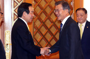 문재인 대통령이 21일 오전 청와대에서 한일의원연맹 일본 누카가 후쿠시로 회장과 악수하고 있다./연합뉴스