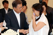 문재인 대통령이 8일 오후 청와대 인왕실에서 열린 가습기 살균제 피해자와의 면담에서 울먹이는 피해자 조순미 씨의 손을 잡고 위로하고 있다. /연합뉴스