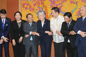 강경화 외교부 장관(가운데)이 1일 오후 서울 도렴동 외교부 청사에서 열린 주한 ASEAN 외교단 차담회에서 손을 맞잡고 있다./연합뉴스