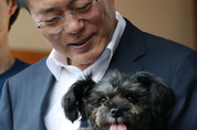 문재인 대통령이 26일 오후 청와대에서 유기견이었던 ‘토리’를 맞이하고 있다. 문 대통령은 대선 선거 운동 때 당선되면 유기견 토리를 입양하겠다고 밝혔으며 그 약속을 지켰다. 유기견이 퍼스트 도그가 된 것은 전 세계에서 우리나라가 처음인 것으로 알려졌다./연합뉴스
