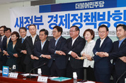 더불어민주당 우원식 원내대표(오른쪽 다섯번째)와 김동연 경제부총리 겸 기획재정부 장관(오른쪽 여섯번째) 등 더불어민주당 의원과 경제장관들이 24일 오전 서울 여의도 국회 의원회관에서 열린 새정부 경제정책방향 당정협의에 참석해 손을 맞잡고 있다./연합뉴스