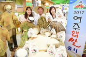 여주에서 올해 첫 수확한 ‘여주햅쌀’을 재배농민인 임기완씨와 모델들이 13일 서울 서초구 농협하나로마트 양재점에서 선보이고 있다. 농협하나로마트 양재점에서는 ‘여주햅쌀 1㎏을 1만5천500원에 100개 한정 판매한다./연합뉴스