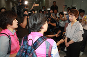 국민의당 이언주 원내수석부대표(오른쪽)가 11일 오후 국회 정론관 앞에서 다음 기자회견 차례인 학교비정규직노조 관계자들을 만나 자신의 파업노동자 발언에 대해 사과하고 있다. /연합뉴스