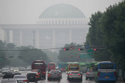 9일 오후 서울 여의도를 오가는 정체된 차량 뒤로 안개에 가려진 국회의 모습이 보이고 있다. 여야간 갈등이 고조되면서 이번주 국회 정상화가 이뤄질지 주목되고 있다. /연합뉴스