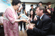 에드워드 브라운스타인 미국 뉴욕주 하원의원이 5일 오전 광주시 퇴촌면 일본군 위안부 피해 할머니들의 쉼터 나눔의집을 방문해 이용수 할머니에게 김순덕 할머니가 그린 그림 ‘끌려감’을 선물받고 있다. /연합뉴스