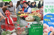 6일 오전 서울 농협하나로마트 양재점에서 김병문 농협유통 대표이사와 직원들이 가뭄과 폭염 피해를 입은 농가 농산물을 모아 판매하고 있다. 농협유통은 가뭄과 폭염 피해 농가를 돕기 위해 이번 행사를 마련했다고 이날 밝혔다./연합뉴스
