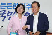 더불어민주당 추미애 대표가 4일 오후 국회 대표실을 방문한 자유한국당 홍준표 새 대표와 대화 도중 “우리가 서로 협치를 국민 앞에 약속한다는 의미에서 팔짱 한번 끼실까요?”라며 홍 대표와 팔짱을 끼고 있다./연합뉴스