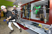 산업안전보건의 날인 3일 오전 서울 강남구 코엑스에서 열린 국제안전보건전시회 참여 업체 관계자들이 추락 방지 솔루션 시연을 하고 있다./연합뉴스