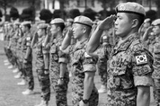 28일 오후 인천시 계양구 국제평화지원단에서 열린 ‘한빛부대 8진 환송식’에서 부대원들이 파병 신고를 하고 있다. 한빛부대 8진은 2개 제대로 나뉘어 각각 7월 3일과 같은달 17일 아프리카 남수단에 파견돼 사회기반시설 개선과 의료지원 등의 임무를 수행한다. /연합뉴스