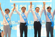 자유한국당 당대표 후보들이 25일 오후 부산항국제여객터미널 컨퍼런스홀에서 열린 부산·울산·경남 합동연설회에서 손을 들어 인사하고 있다. 왼쪽부터 원유철, 홍준표, 신상진 후보. /연합뉴스