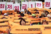 19일 오후 서울시 마포구 경총회관 앞에서 민주노총 서비스연맹 조합원들이 최저임금 인상과 이를 방해하는 적폐세력들의 청산을 촉구하는 집회를 하고 있다./연합뉴스