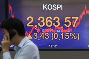 코스피가 3.43p 오르며 2,363.57로 장을 마감한 8일 오후 서울 중구 을지로 KEB하나은행 본점 딜링룸에서 한 딜러가 전화를 하고 있다./연합뉴스