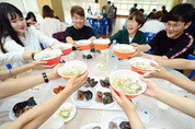 23일 오후 인천시 연수구 인천대학교에서 열린 북한음식체험행사에서 학생들이 북한음식인 ‘온밥’을 들어 보이며 식사 전 인사를 하고 있다. /연합뉴스