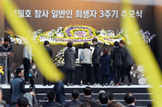 세월호 참사 3주기인 16일 오전 인천시 부평구 인천가족공원 세월호일반인희생자추모관 앞에서 열린 추모식에서 희생자 유가족들이 헌화하고 있다. /연합뉴스