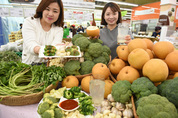 13일 서울 서초구 농협하나로마트 양재점에서 모델들이 미세먼지배출에 탁월한 농산물을 선보이고 있다. 농협하나로마트는 미세먼지에 배출에 효과가 좋은 배, 마늘, 미나리, 브로콜리 등을 오는 16일까지 최대 28% 할인 판매한다./연합뉴스