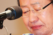 자유한국당 대선후보인 홍준표 경상남도 지사가 10일 오전 경남 창원시 의창구 경남도청 신관 대강당에서 열린 ‘제35대ㆍ제36대 홍준표 도지사 퇴임식’에서 퇴임사를 하던 중 눈물을 보이고 있다. /연합뉴스