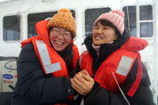 29일 전남 진도군 동거차도 인근 세월호 작업 현장으로 향하는 경비정에서 미수습자 조은화양의 어머니 이금희(왼쪽)씨와 허다윤양의 어머니 박은미씨가 ‘세월호 미수습자 지원법 국회 법사위 통과’ 소식을 듣고 기뻐하고 있다./연합뉴스