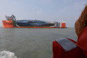 세월호 미수습자 가족들이 27일 오전 전남 진도군 세월호 사고 해역 인근에서 반잠수선에 실려 마지막 항해를 위해 해수 배출 등 준비작업 중인 세월호를 바라보고 있다. 세월호는 배수와 방제 작업을 마치고 30일 전후 목포신항으로 출발한다. /연합뉴스
