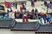 포근한 초봄 날씨를 보인 12일 오후 서울 종로구 경복궁에서 관광객들이 수문장 교대식을 관람하고 있다. /연합뉴스