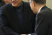반기문 전 유엔사무총장과 새누리당 정진석 전 원내대표가 25일 오후 서울 중구 프레스센터에서 열린 ‘반기문 전 유엔사무총장 초청 관훈토론회’에서 인사를 하고 있다./연합뉴스