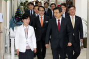 황교안 대통령 권한대행 국무총리가 10일 오후 안성시 북한 이탈주민 정착지원사무소의 의료시설을 홍용표 통일부 장관 등과 함께 둘러보고 있다./연합뉴스