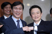 올해 대선에 도전한다는 뜻을 밝힌 안희정 충남지사(왼쪽)와 남경필 경기지사가 9일 서울 여의도 국회 정론관에서 기자회견을 마치고 주먹을 맞대고 있다. 더불어민주당 소속인 안 지사와 바른정당 소속인 남 지사는 "소속정당은 다르지만 세종시를 완성해 대한민국의 비전을 바로 세우자고 결의했다"고 말했다. /연합뉴스